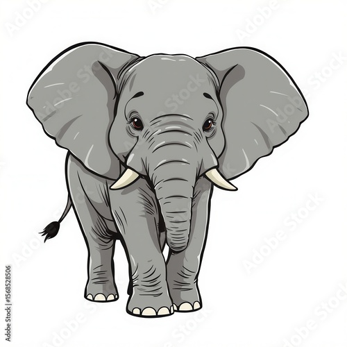 © Ardi, Obraz premium Cartoon elephant stands on a white backdrop with its large ears out, trunk down and tail swinging.
