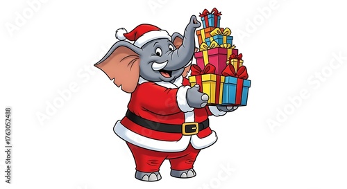 © Joao, Obraz premium Cartoon elephant wearing santa costume holding a stack of christmas gifts on a white background