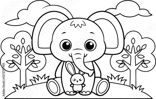 Fototapeta premium Cartoon Elephant with Bunny in a Forest Outline Illustration, Line art, Cute