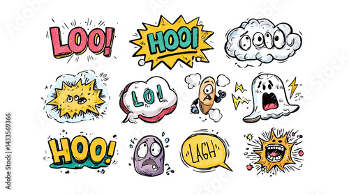Fototapeta premium Cartoon emotion stickers PNG with speech bubbles, funny faces and comic expressions like LOO and HOO