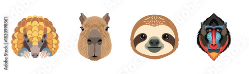 © supplement, Fototapeta premium Cartoon faces of pangolin, capybara, sloth, and mandrill on white background