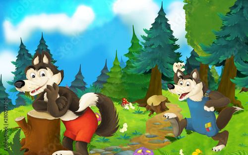 Fototapeta premium Cartoon fairy tale scene with wolf on the meadow - illustration for children