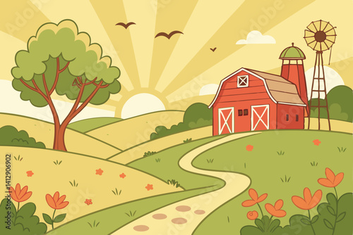 Fototapeta premium 29 Cartoon farm landscape, vibrant sunset sky, red barn, water tower, windmill, curved dirt road, lush green trees, rolling hills, colorful flowers, birds flying, warm golden sunlight, panoramic view,