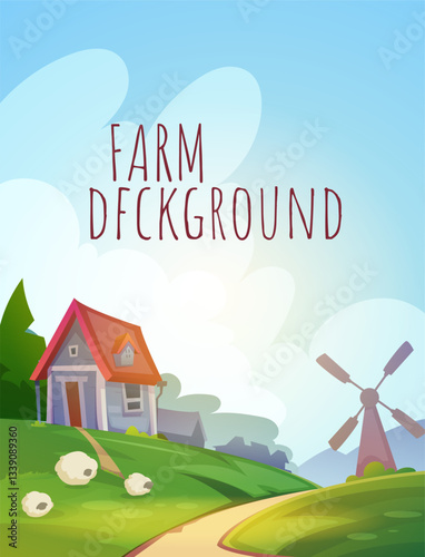 © Rudzhan, Naklejka premium Cartoon farm landscape with a small house on a green hill, a dirt path, sheep, and a windmill in the background. Bright sky with clouds and sun. Rural countryside scene. Vector illustration
