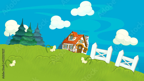 © agaes8080, Naklejka premium cartoon farm ranch with meadow with space for text illustration