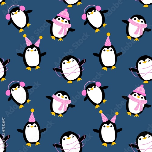 © Tetiana, Fototapeta premium Cartoon festive animals seamless birthday decor and penguin pattern