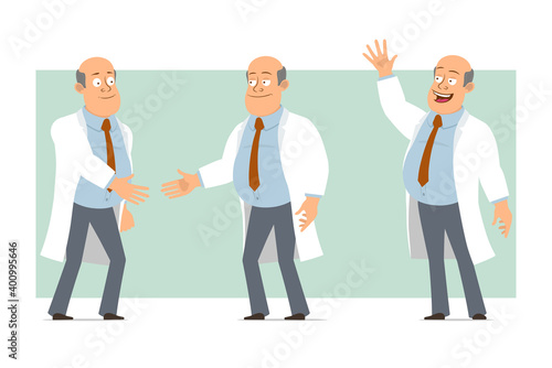 Fototapeta premium Cartoon flat funny fat bald doctor man character in white uniform with tie....