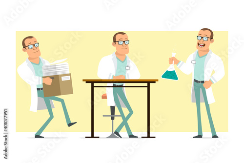 © GB_Art, Obraz premium Cartoon flat funny strong doctor man character in white uniform and glasses. Boy carrying box with papers and holding chemical flask. Ready for animation. Isolated on yellow background. Vector set.