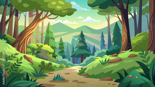 Naklejka premium Cartoon forest path winding through lush green trees and rolling hills