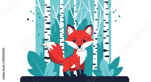 Obraz premium Cartoon fox in a birch forest with green leaves