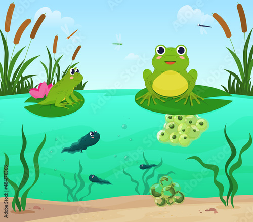 © Vikivector, Obraz premium Cartoon frogs sitting on lily leaves at pond nature environment surrounded by reeds vector