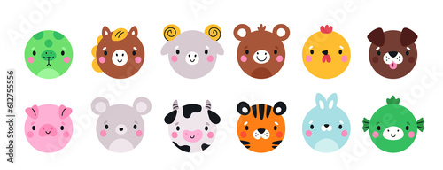 Fototapeta premium Cartoon funny animals round faces. Fauna avatars. Circle shapes app icons....