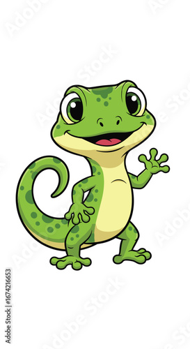 Obraz premium Cartoon gecko waves hello with a friendly smile. Cartoon character, reptile,...