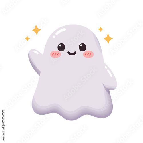Obraz premium cartoon ghost with round soft body, blush cheeks, waving hand, pastel details,