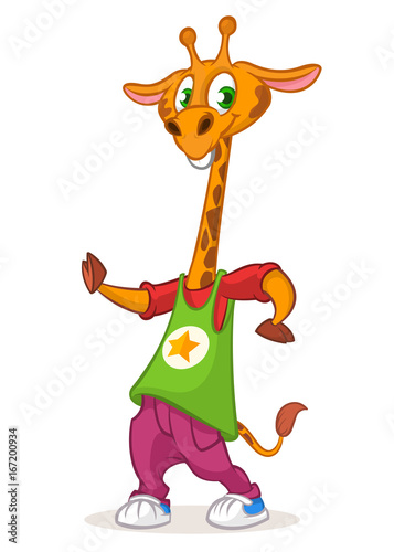 © drawkman, Naklejka premium Cartoon giraffe dancing. Vector illustration of happy giraffe dancing disco or hip-hop. Design for mascot, poster or icon