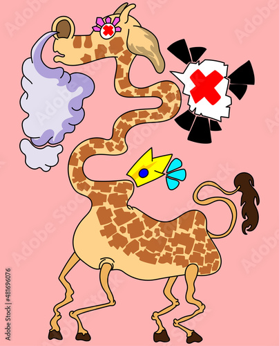 © Rizki, Obraz premium cartoon giraffe with curly neck and smokey nose