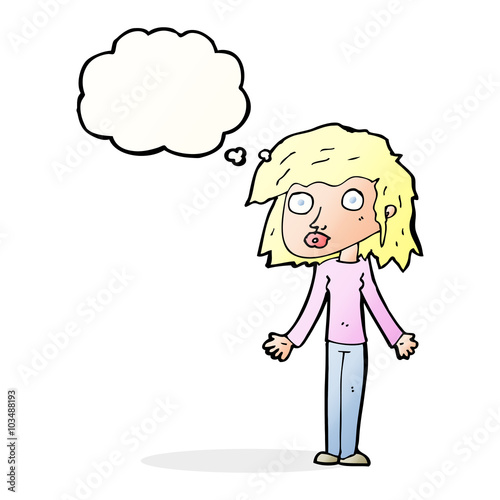 Obraz premium cartoon girl shrugging shoulders with thought bubble
