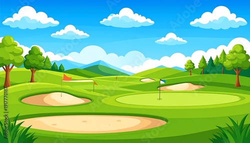 Obraz premium Cartoon golf course with rolling green hills, sand traps, trees, and a bright blue sky with fluffy clouds