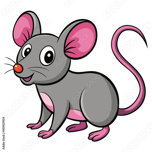 Obraz premium Cartoon Gray Mouse with Pink Ears, Tail and Red Nose on White