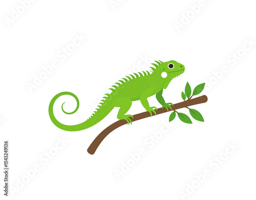 © Project, Obraz premium Cartoon Green Iguana Perched on a Branch with Leaves Vector Illustration.