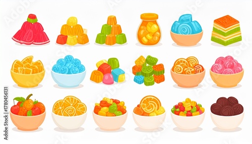 © MdRakibul, Fototapeta premium Cartoon gummy set. Jelly candy, fruity delicious chewy sweets with various flavors