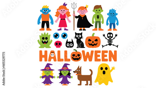 Fototapeta premium Cartoon Halloween Illustration Featuring Monsters, Witches, Pumpkins,...