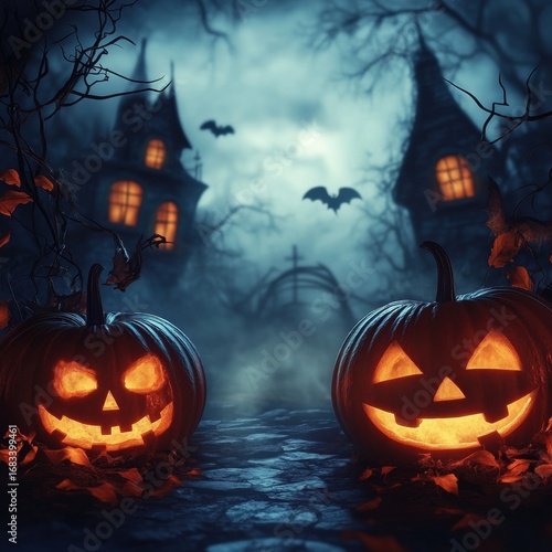 Fototapeta premium Cartoon Halloween illustration with two glowing pumpkins in the foreground...
