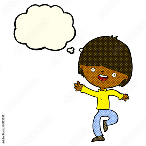 Obraz premium cartoon happy boy dancing with thought bubble