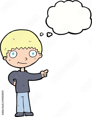 Fototapeta premium cartoon happy boy pointing with thought bubble