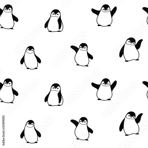 © Lili Kudrili, Obraz premium Cartoon happy character - simple trendy seamless pattern with penguin. Flat vector illustration.