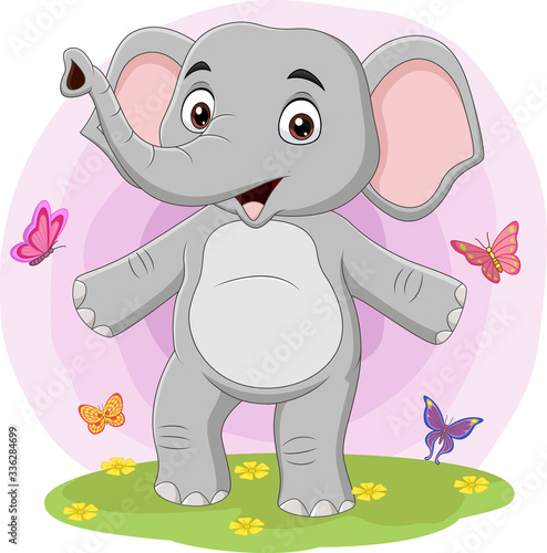 Fototapeta premium Cartoon happy elephant with butterflies in the grass