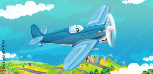 Fototapeta premium cartoon happy traditional plane with propeller smiling and flying over city