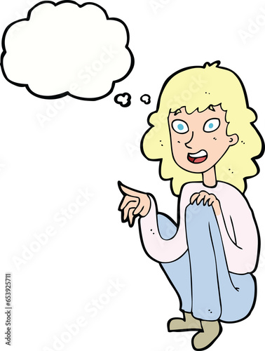 Obraz premium cartoon happy woman sitting and pointing with thought bubble