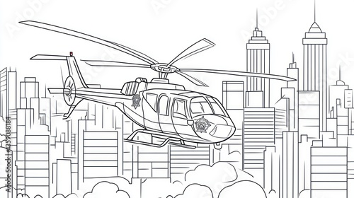© Falfa, Obraz premium Cartoon Helicopter Over City Skyline, Coloring Book