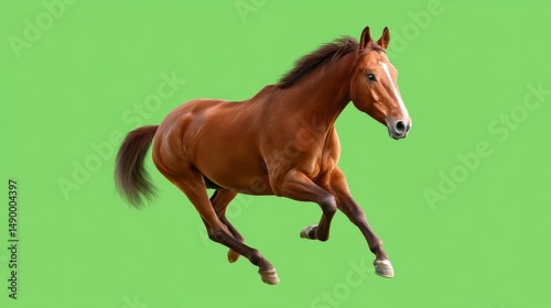 © Phatharaporn, Naklejka premium Cartoon Horse Performing High Jump Against Bright Green Background
