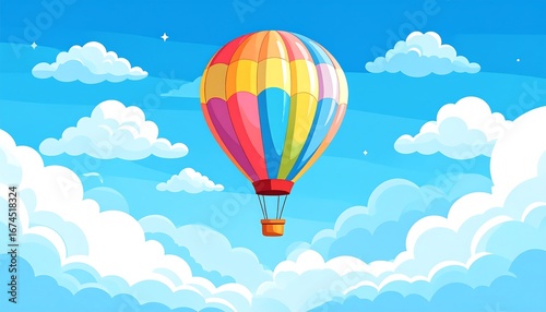 Fototapeta premium Cartoon hot air balloon floats in bright blue sky with fluffy white clouds
