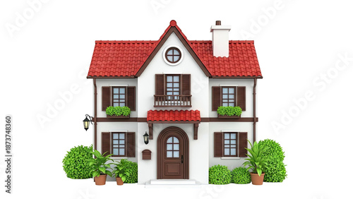 © vinny, Fototapeta premium Cartoon House with Red Roof and Greenery