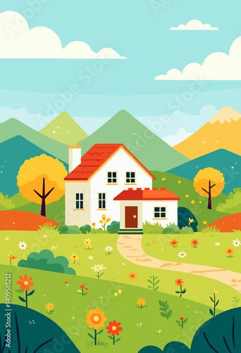 © ArtisticAllure, Fototapeta premium Cartoon House with Red Roof in Green Mountain Landscape