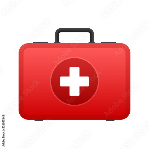 Obraz premium Cartoon icon with red first aid on white background for medical design. Flat vector illustration