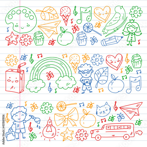 Fototapeta premium Cartoon icons with education items. Online lesson. E-learning.