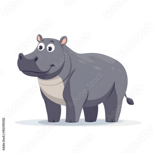 Fototapeta premium Cartoon illustration depicts a friendly smiling hippopotamus standing on a ground plane.