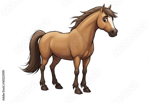 © fisik, Fototapeta premium Cartoon illustration of a brown horse standing, with a dark mane and tail, on a white background.