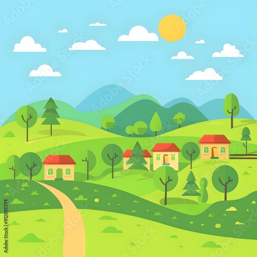 © Adobe Contributor, Fototapeta premium Cartoon Illustration of a Green Meadow with Hills and Houses