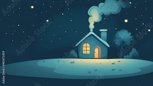Fototapeta premium Cartoon illustration of a house with a lit window and smoke coming from the...