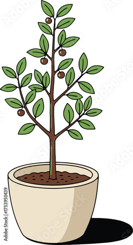 © MdSakil, Fototapeta premium Cartoon illustration of a small fruit tree with brown berries in a cream colored pot on a white background