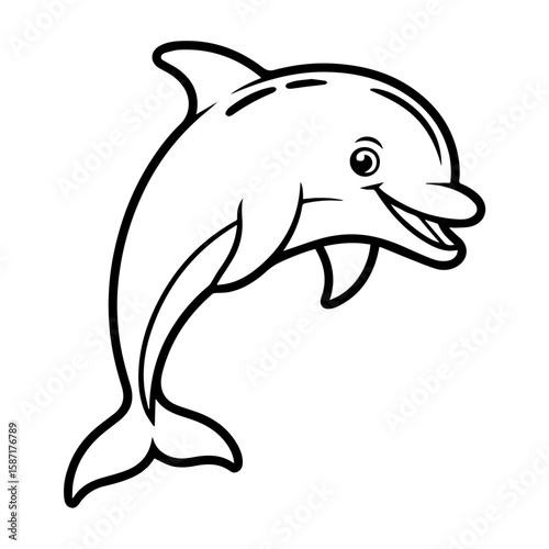 Fototapeta premium Cartoon illustration of a smiling dolphin leaping upwards, outlined in black...
