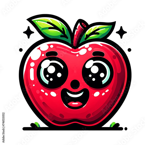 © Maule, Obraz premium Cartoon illustration of a vibrant red apple with a cute, smiling face and sparkling eyes, full of character and whimsy.