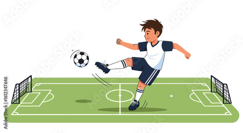 Fototapeta premium Cartoon Illustration of a Young Soccer Player Kicking a Ball on the Field...
