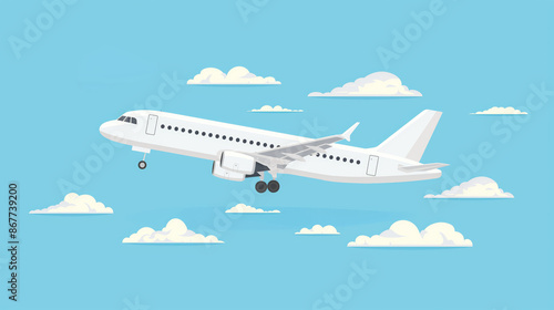 © Viktoria Tom, Obraz premium Cartoon illustration white airplane flying with landing gear extended against a blue sky.