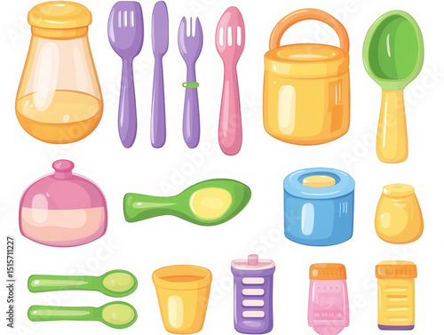 Obraz premium Cartoon Kitchen Utensils and Containers Colorful Set on Transparent Background